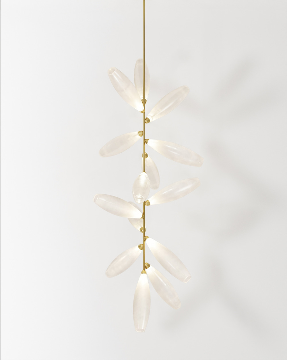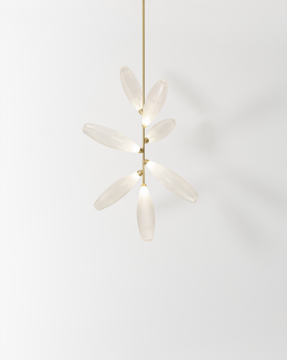 Gem is a suspension lamp, in hand blown glass, made with “a lume” technique, which is another expertise within the Veneto region. The surface can be clear or with a “corroded” finish, which seams like a white moon dust coating. There are several compositions from linear to bunches. The glass gems cling to a brass tube, via brass buds which contain a proprietary led source.