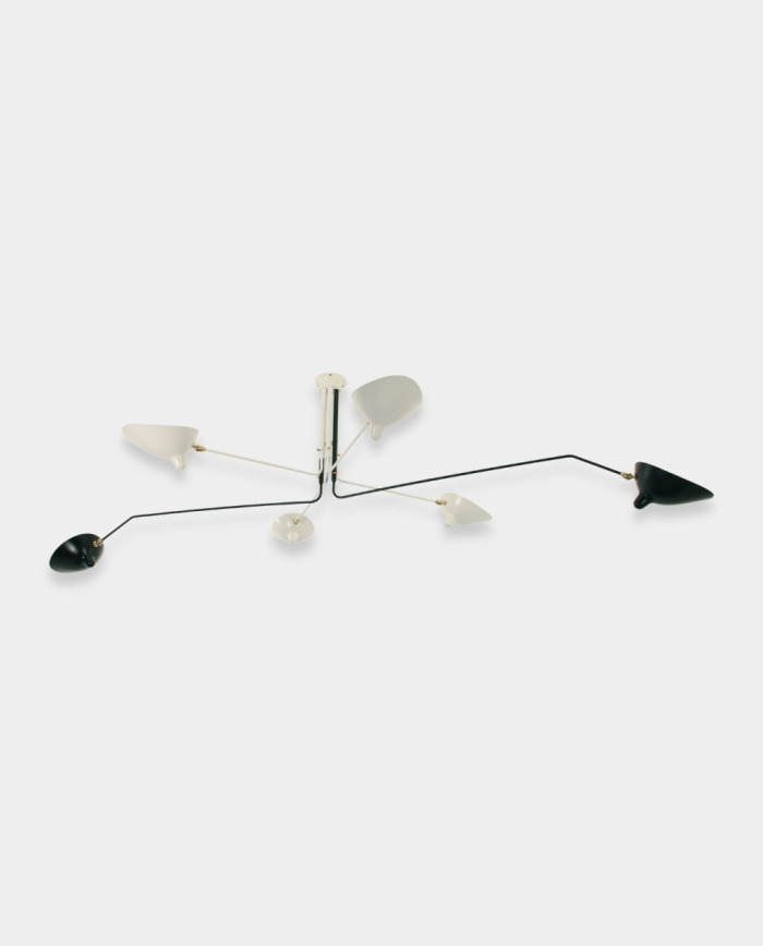In 1953 Jacques Adnet hired him to design lighting fixtures, an art to which he devoted the rest of his life. Throughout the 1950s Mouille designed large, angular, insect-like wall mounted and standing lamps with several arms and smaller, more curved wall-sconces. Some of his best known designs from the period are his “Oeil” lamp (1953), “Flammes” (1954) and “Saturn” (1958). He worked to achieve a kinetic, sculptural aesthetic that evoked a sense of movement in space. He also claimed his lighting fixtures were “a reaction to the Italian models, which were beginning to invade the market in 1950,” and which he thought to be “too complicated.” His designs from this period were shown mainly at the Steph Simon Gallery in Paris. Towards the end of the 1950s the invention of neon tubes inspired Mouille to create a series of floor lamps that combined incandescence and fluorescence. These designs, called the “Colonnes” collection, had their debut at the 1962 Salon for interior design, and are some of his better known later works.