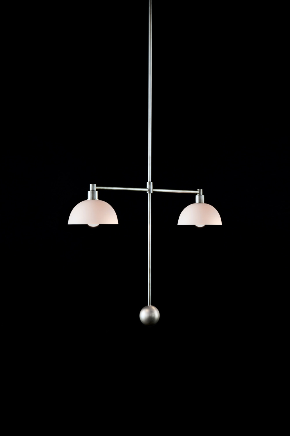 Inspired by the tension and dynamics of the circus act this pendant is a triangle fixed in space. Uninterrupted lines suspend glowing circles from the ceiling creating soft light and graphic appeal. Available with either brass or hand-cast porcelain bowl.