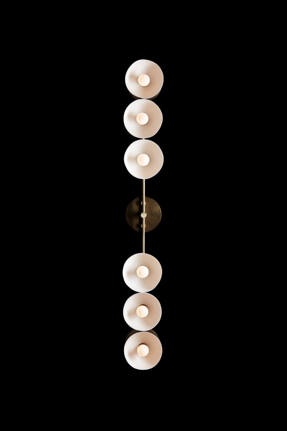 Inspired by the tension and dynamics of the circus act this pendant is a triangle fixed in space. Uninterrupted lines suspend glowing circles from the ceiling creating soft light and graphic appeal. Available with either brass or hand-cast porcelain bowl.