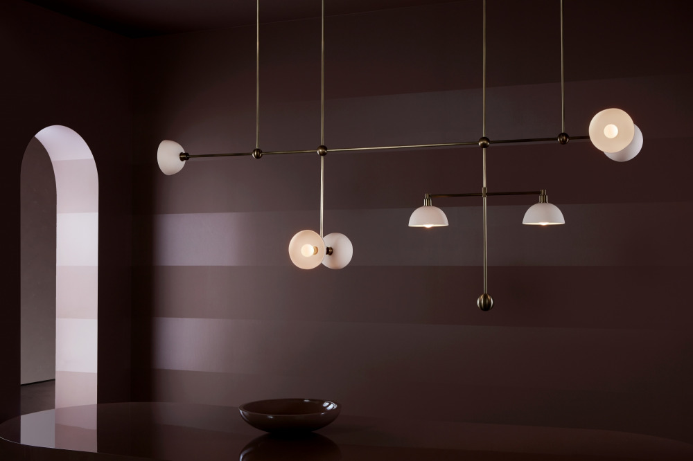 Inspired by the tension and dynamics of the circus act this pendant is a triangle fixed in space. Uninterrupted lines suspend glowing circles from the ceiling creating soft light and graphic appeal. Available with either brass or hand-cast porcelain bowl.