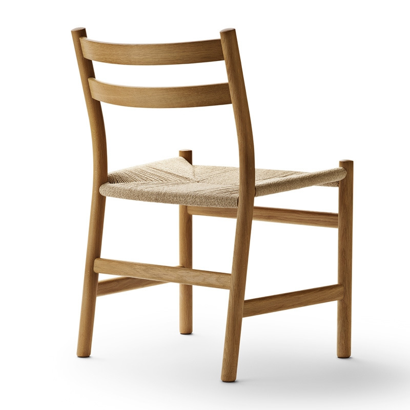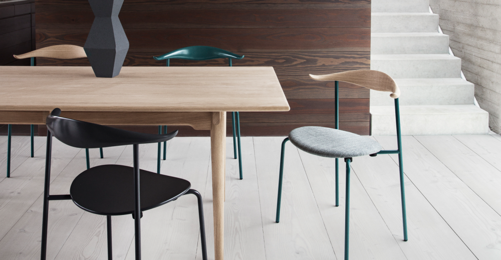 The CH88 and CH88T are versatile both in terms of its appearance and usability thanks to its numerous finish, frame, and room placement options. Characteristically, the upper structure features a steam-bent wooden backrest for back support, with slight curvatures of the backrest’s ends providing a natural resting place for the arms. The steel frame, with straight back legs, supports an oval-shaped wooden seat. The seat is available upholstered or a timber finish. This blend of materials, combined with a minimalist design, results in a light, organic, industrial expression.