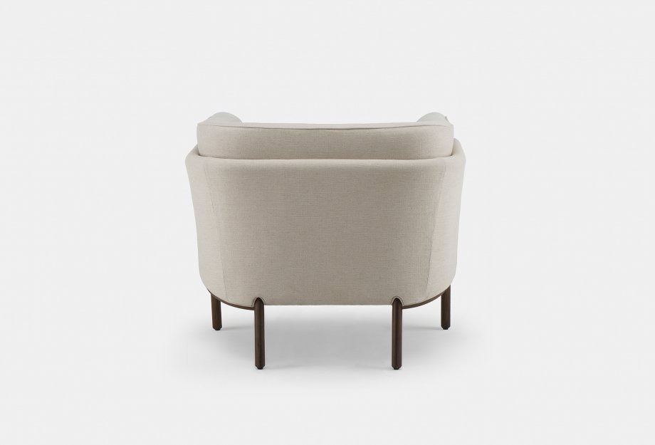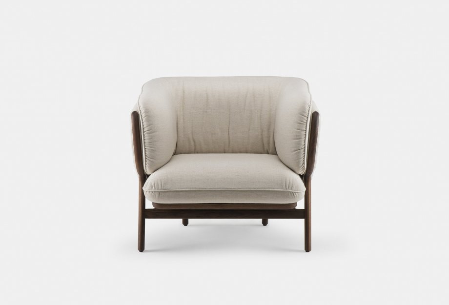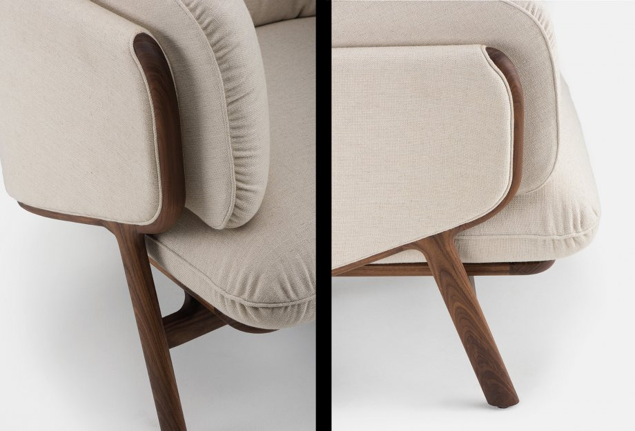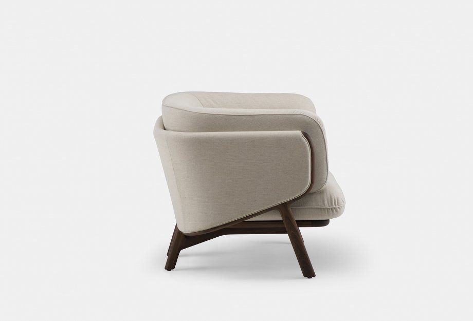 The exposed solid wood frame is the elegant focal point of Stanley, where the expert woodwork is revealed in the details of the joinery. The taut upholstery of the backrest provides a crisp appearance, while the deep back cushions with generously folded upholstery portray the exceptional comfort the chair offers.