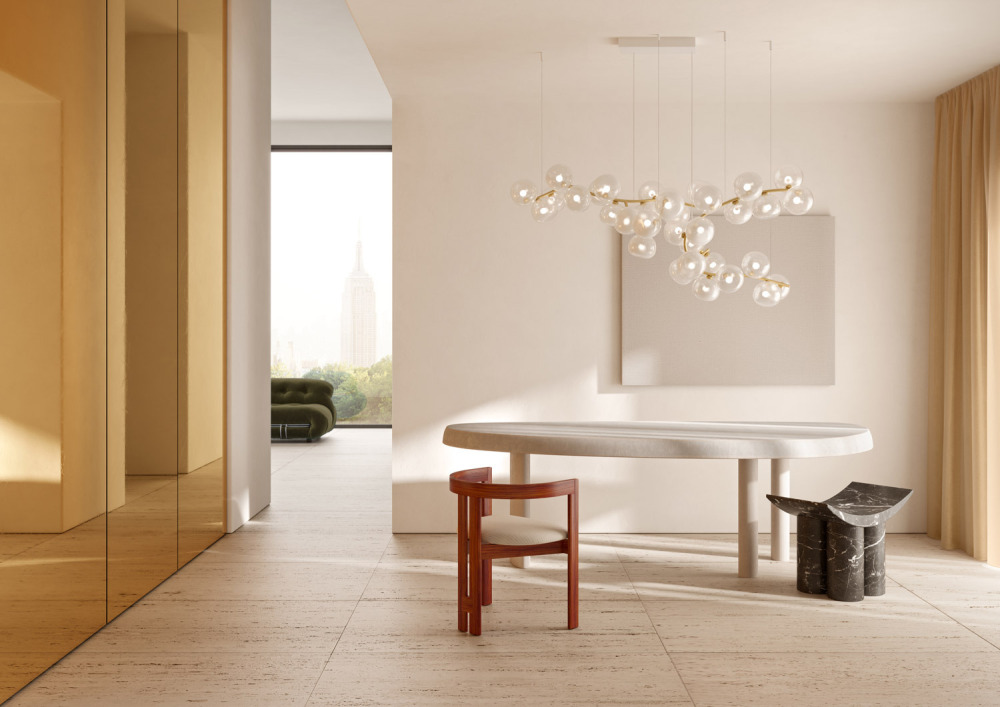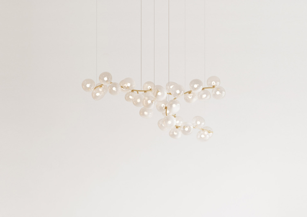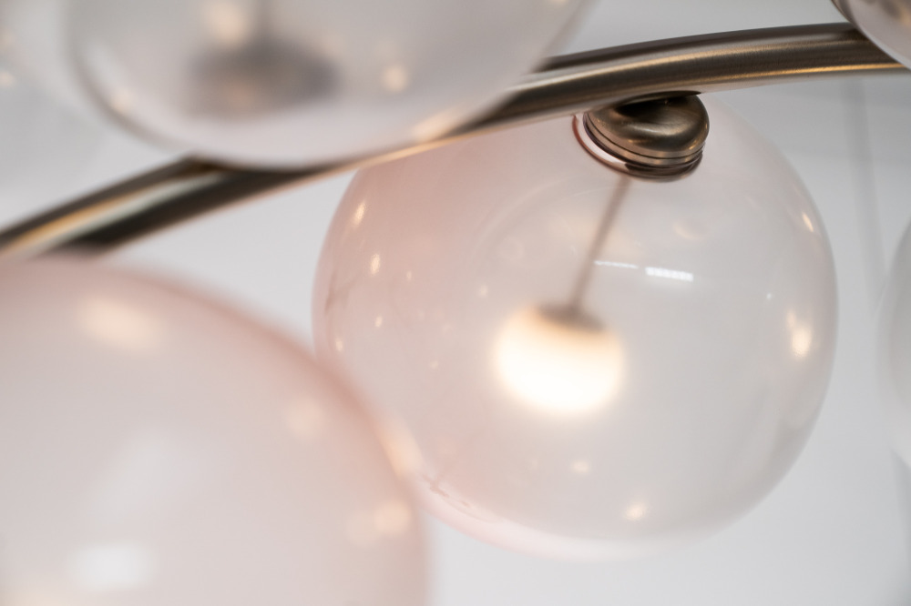 Each element – the modular brass structure, the glass spheres, and the light source, interacts effortlessly with all the others.