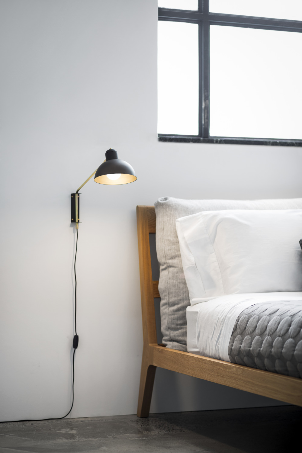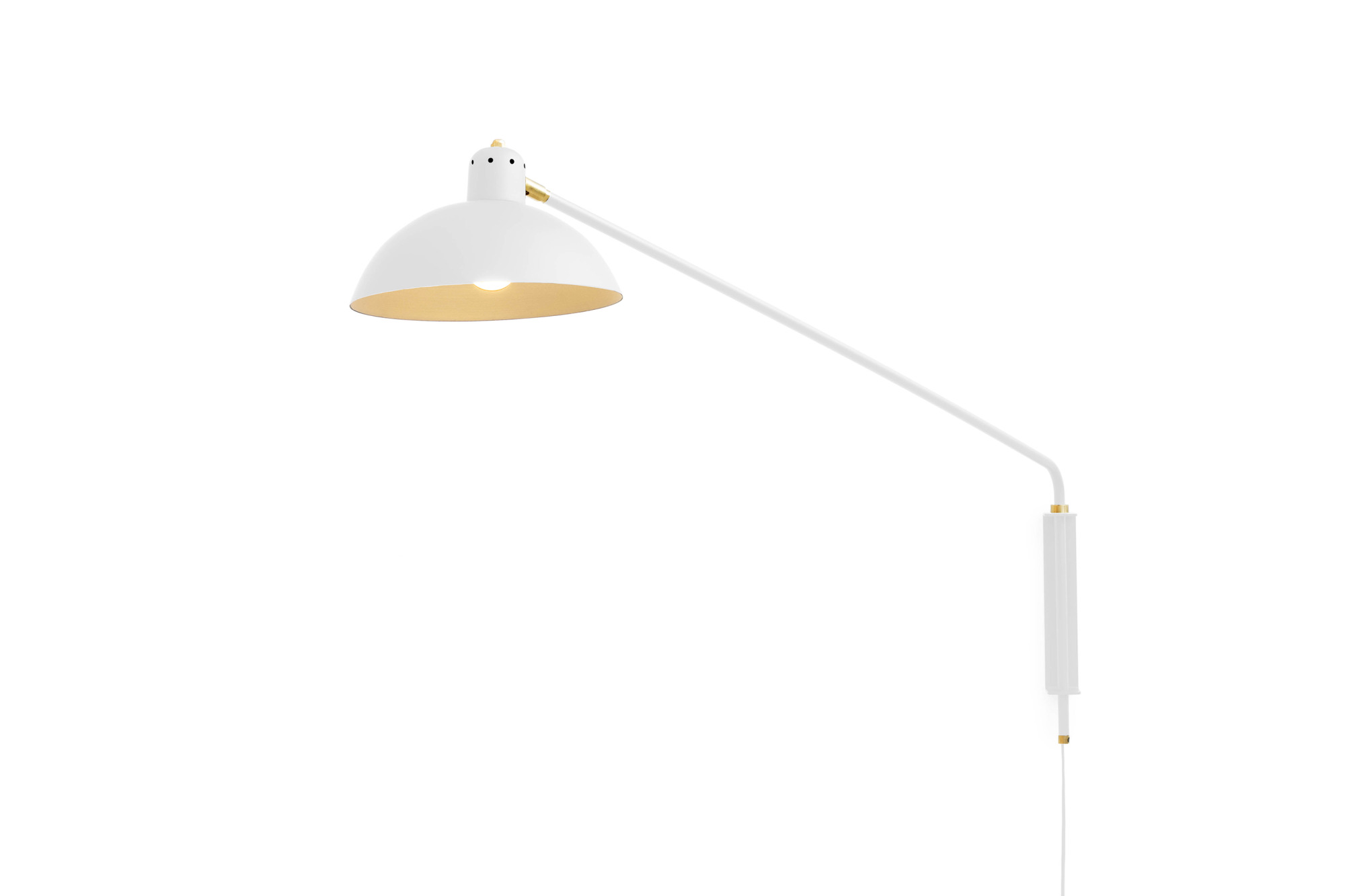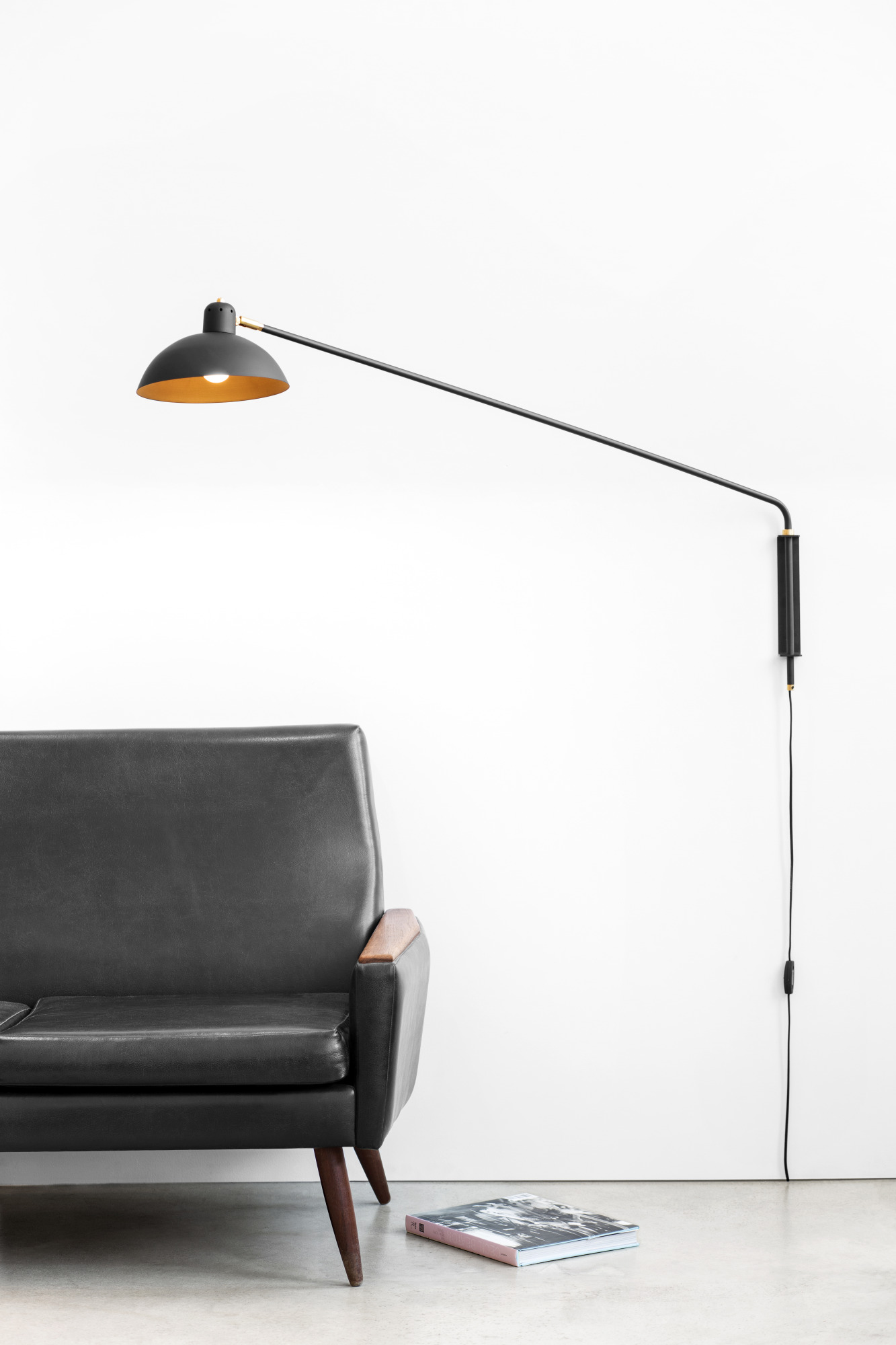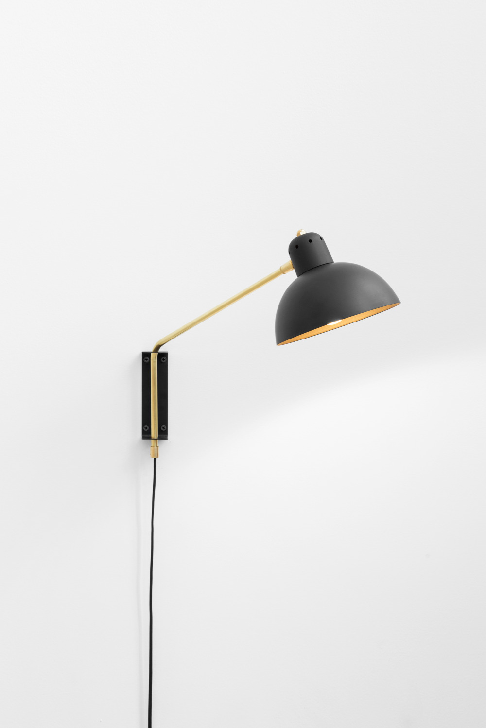The Waldorf Collection combines an open hemispherical shade with a cylindrical socket cover. This composite shade is deployed in suspension and wall-mounted configurations with natural brass and powder coated rods. Moving parts add flexibility to the crisp, streamlined forms of this collection.