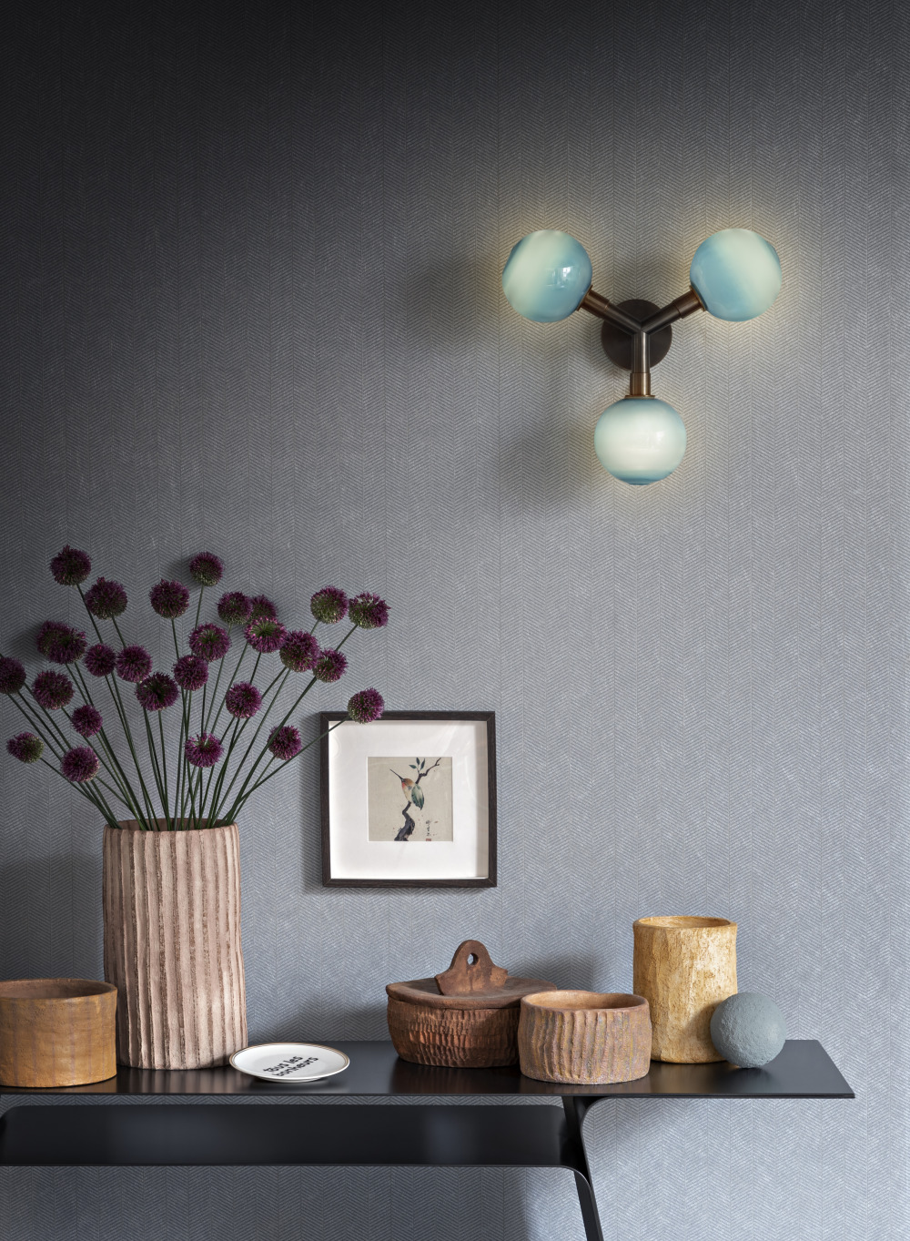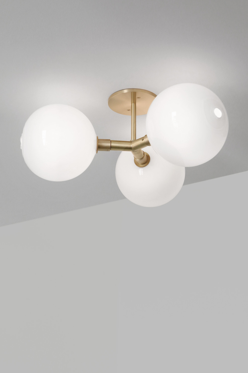The Stem 3X Sconce/Ceiling is a minimal light consisting of 3 4.5"/110mm diameter diffusers of handblown Czech glass on a 3-arm brass structure. Suitable for use as a ceiling light or as a wall light. The glass diffusers are available in both "dipped" glass, featuring the SkLO double-dipped flame-polished mouth and "textured" glass, featuring a soft, frosted finish and subtle sculpted vertical ridges.