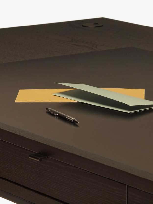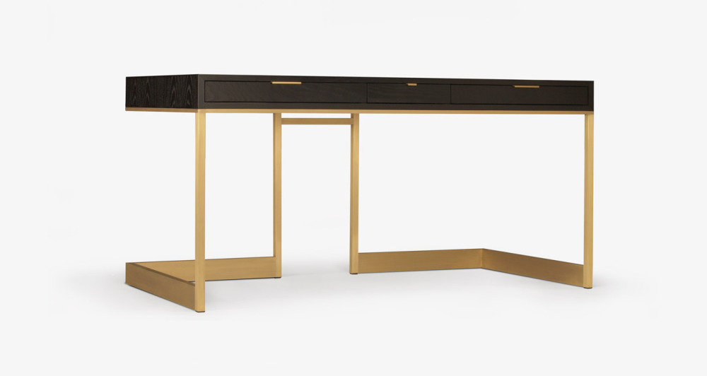 Skram’s original wishbone drawer desk is offered in 2 standard models and a variety of hand book-matched veneers and metal finishes. Hardwood veneer longwoods are hand book-matched. Construction is mitered with ‘waterfall’ edges and mortise-and-tenon joinery. All edges and corners are reinforced with solid timber for added durability. These models have three drawers in solid maple with cork-lined bottoms riding on soft-closing concealed runners and opening via low-profile tab pulls (matched to metal finish). The W26 & W27 desk drawers also include integrated machined cork pencil trays. Integrated connectivity and wire management options are available for this product. Custom sizes, configurations, and materials are available. Residential or contract use.