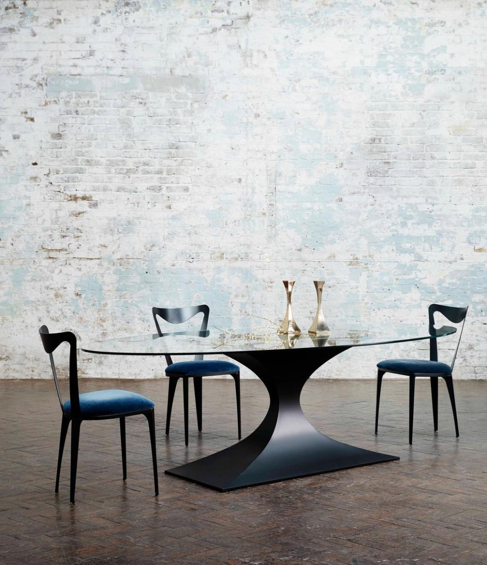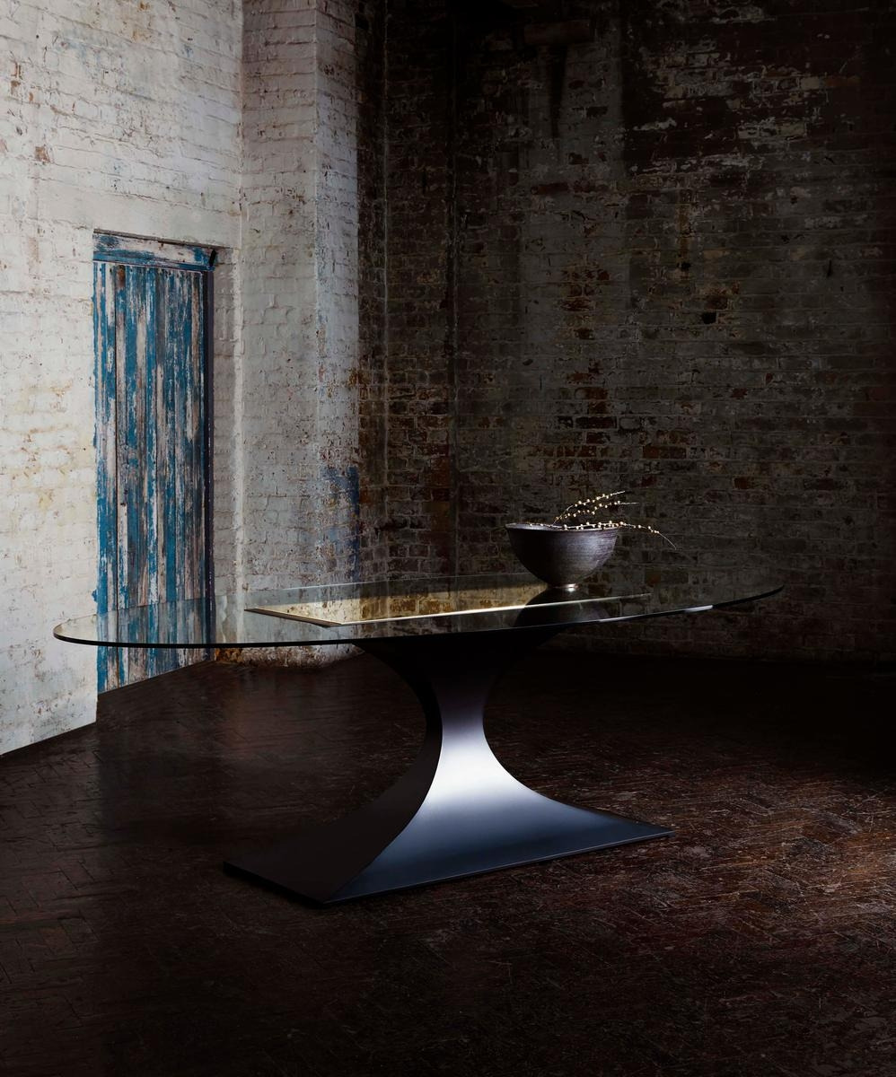 Capricorn is our signature piece. It is a strong sculptural design with bold curves – a timeless classical silhouette. It is available in a selection of our standard and specialist finishes and looks stunning in hand-polished stainless steel. Because of its simplicity Capricorn can be paired with many of our dining chairs, and can be custom made to size.