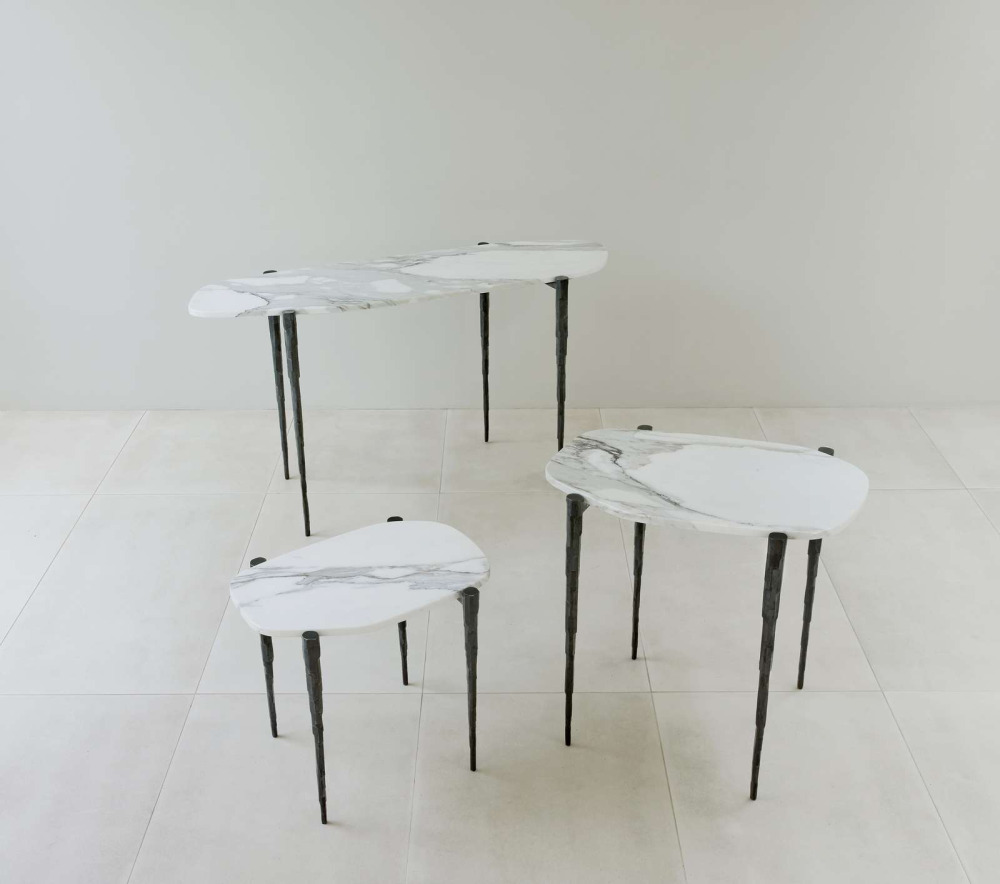 The legs of these marble side tables are made by a skilled blacksmith, and each one is hammered by hand. The marble itself looks like it is ‘floating’ above the frame, and the overall look is delicate and ‘insect-like’.