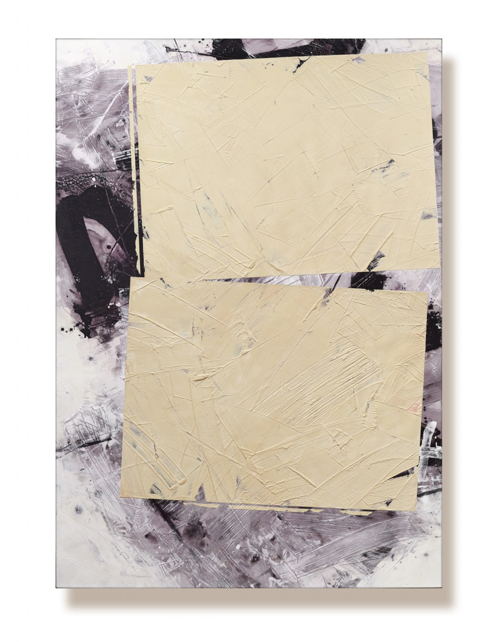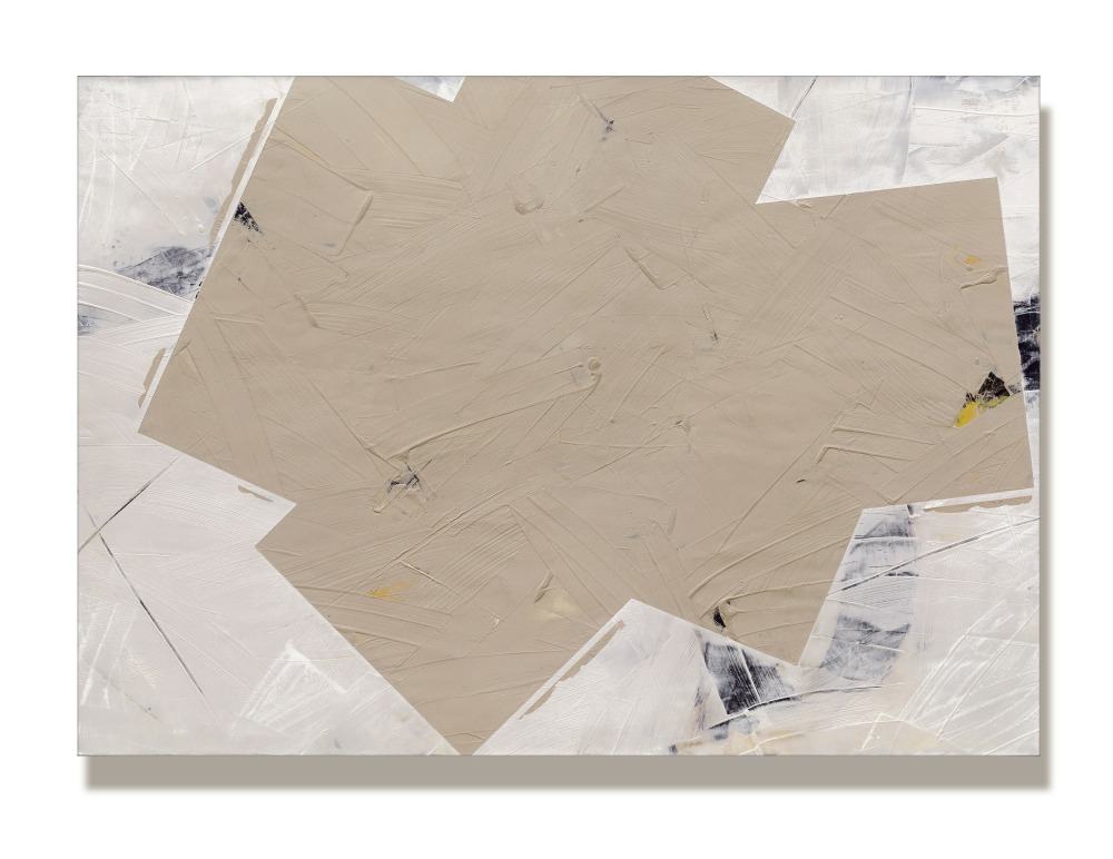 The artist begins with an abstract monochromatic background using spontaneous and controlled brushstrokes. This serves as a support for large geometric forms, which are aesthetically balanced masses of colour, creating a composition with visual tension (addition, subtraction, rotation, concentration, movement, directionality, and order) and poetic value. Colour is related to the shape and is raw and vibrates. The space exists to provoke and communicate pure exploration of the senses.Stoyanov uses a combination of acrylic paint mediums, marble dust, pigments, and cold wax mediums, resulting in a satin surface, rich with visual texture and energy.