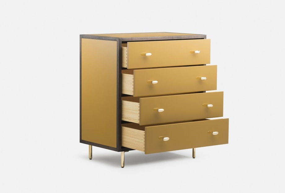 Available in American black walnut, American white oak, or European Ash in a range of finishes; with painted HDF in a choice of our full range of colours with a satin matte or gloss finish. Legs and drawer pulls in polished bronze.