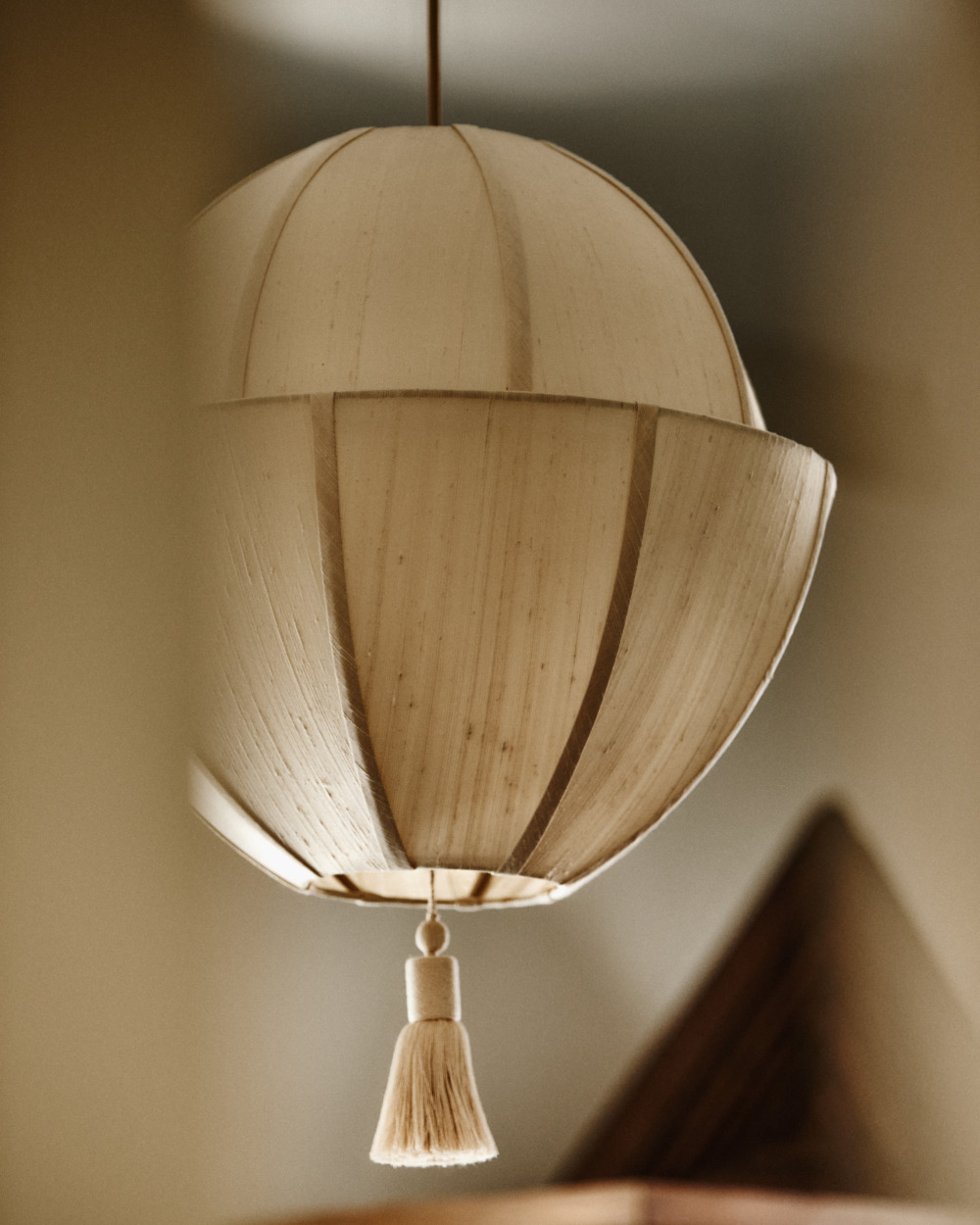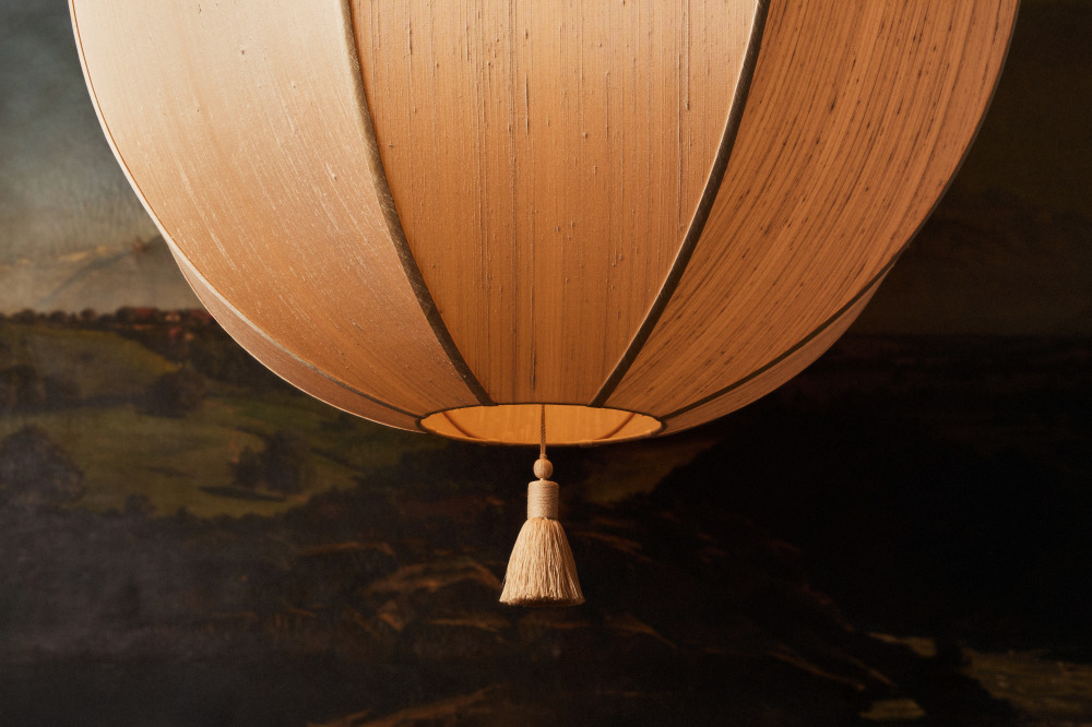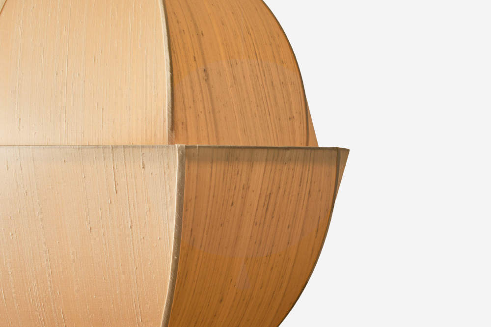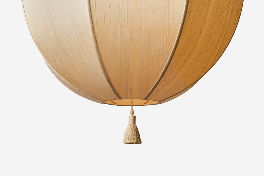 The LANTERN PENDANT  celebrates scale and sophistication, commanding attention through its sculptural presence and luxurious materials. Handcrafted in the USA, each custom shade features two subtly inset, mirrored half-domes joined along the equator - wrapped in luminous 100% Dupioni Raw Silk that glows with warmth and depth. Custom hardware and a hand-finished tassel complete the piece, with every inch of its expansive silhouette meticulously detailed for visual impact and lasting quality. Despite its grand scale, the pendant floats with an airy elegance, becoming an immediate focal point and a testament to craft