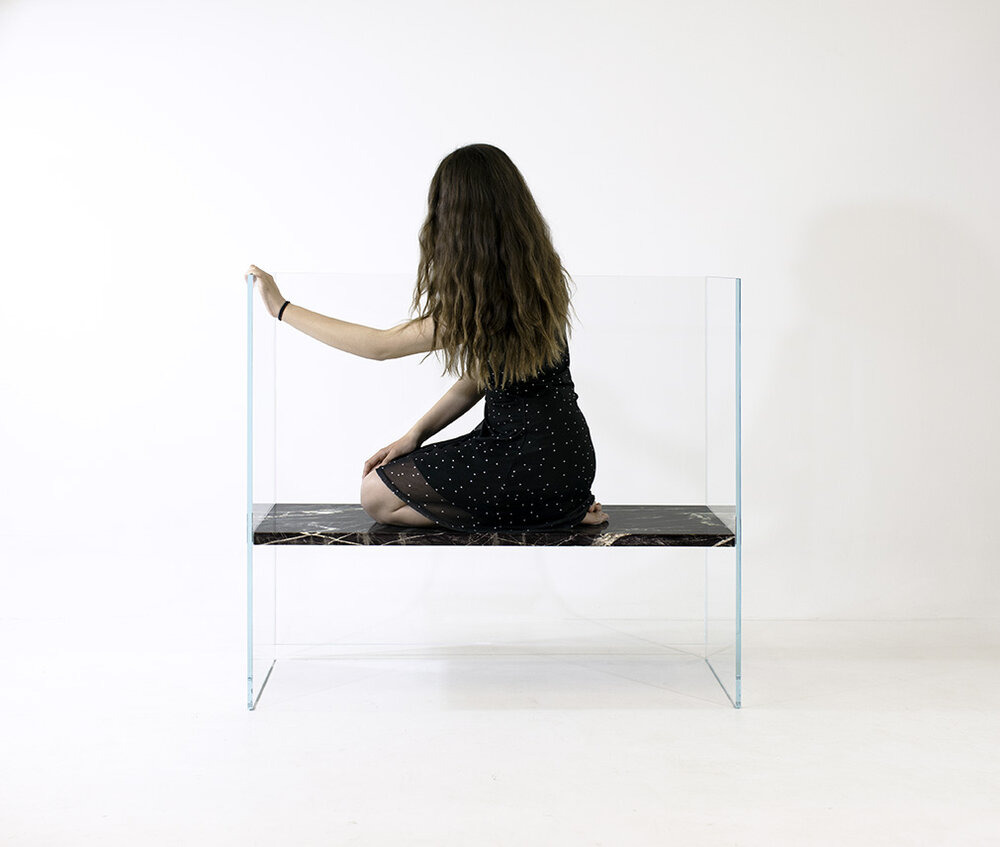 A lovers bench where one’s sense of privacy and enclosure is only limited by what is socially acceptable. Available in two heights and choice of clear or bronzed glass this piece become a visual focal point in any space while creating a welcome retreat albeit more so mentally than physically. The high back combined with the depth of the floating marble slab are designed to allow for a surprisingly comfortable seated position while the fragile and delicate nature of the design pushes the experience beyond the expected.